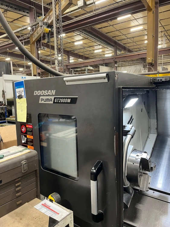 DOOSAN PUMA GT 2600M available, a 2017 model CNC universal turning and milling center. This used 2-axis and 3-axis lathe from renowned manufacturer DOOSAN is ideal for precise and efficient machining tasks.