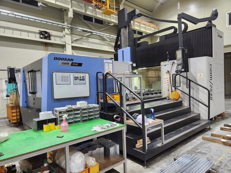 DOOSAN DBM-2540, 2019 VMC Gantry, used. Features FANUC 31IB CNC, 8,000 RPM spindle, 73.8 hp motor, and 60-tool ATC. Equipped with chip conveyor, Renishaw tool measurement, and 20 BAR coolant. Large table and robust performance for serious machining needs.
