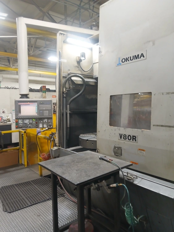 OKUMA 1SP V80R CNC Vertical Turning Center from 2008, features a 31.5" table diameter, 39.37" swing diameter, and 33" turning height. Equipped with OSP-200L CNC control, high-pressure coolant, and a 60hp spindle motor. Includes SMW Autoblok 800mm chuck.