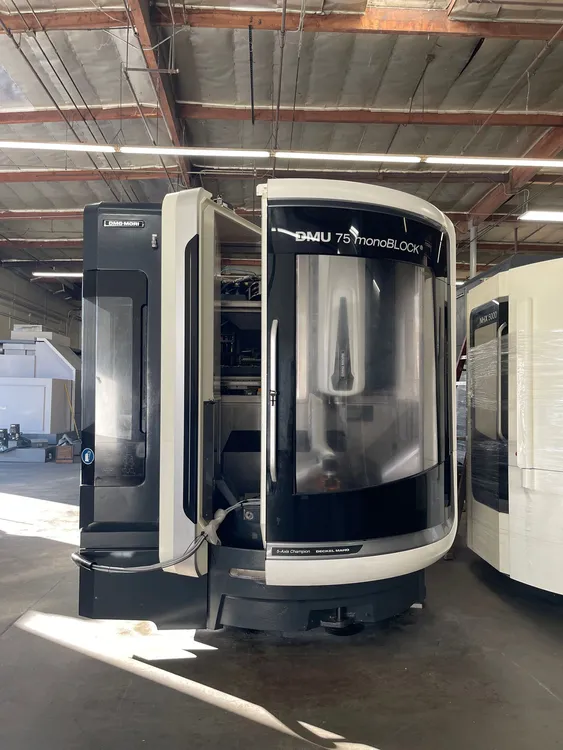 For sale: 2020 DMG MORI DMU 75 Monoblock CNC 5-axis vertical machining center. Featuring 47 hp spindle, 20,000 RPM, integrated NC rotary table, and 60-tool ATC. Equipped with CELOS control, air blast, chip conveyor, and more. Excellent for precision engineering projects.