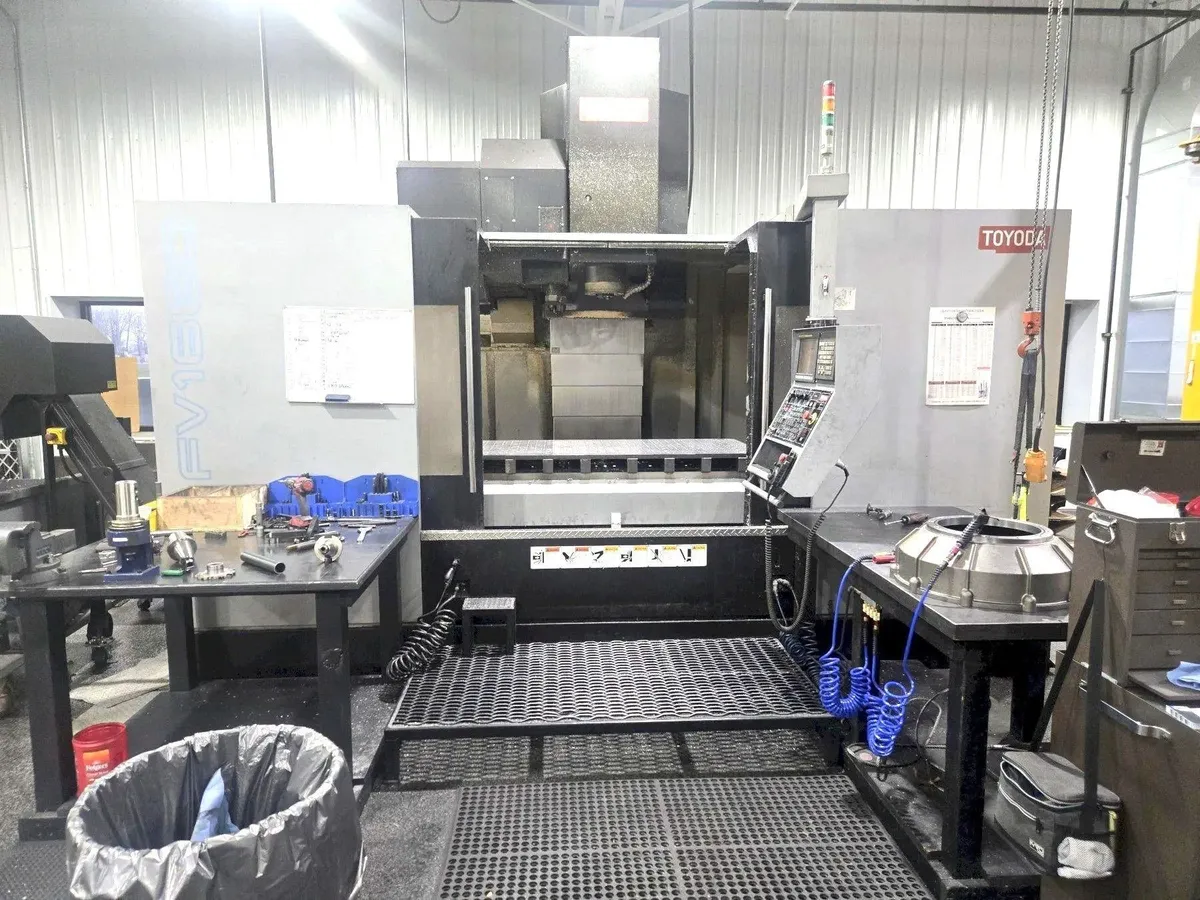 2015 TOYODA FV 1680 CNC Vertical Machining Center. Enjoy precision with Fanuc OI-MD control, rapid traverse rates, and a spindle speed of 6000 RPM. Features a 63" x 31.5" table, 40-tool changer, and extras like a chip conveyor and spindle chiller.